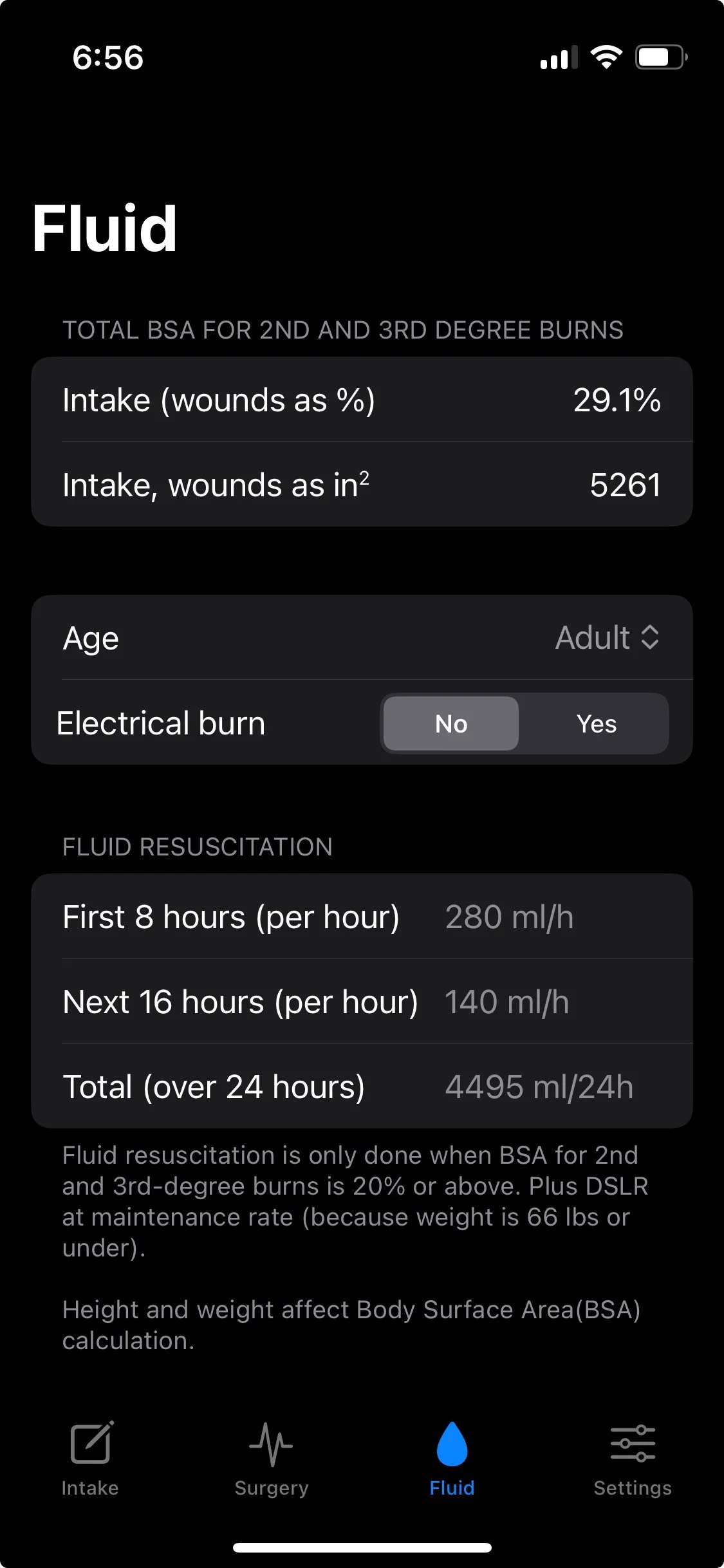 This iOS app helps reduce the amount of paperwork a medical practitioner needs to do by hand by (a) calculating the affected surface area in cm^2 (not just percentages) and (b) generating a PDF report you can upload to the patient’s chart, a report which contains a breakdown by area (e.g. this many cm^2 for palm of right hand, etc). For serious burns, it also shows fluid management, using one of the two commonly used formulas.